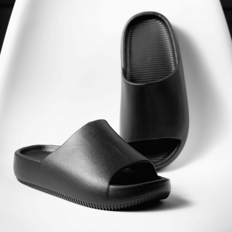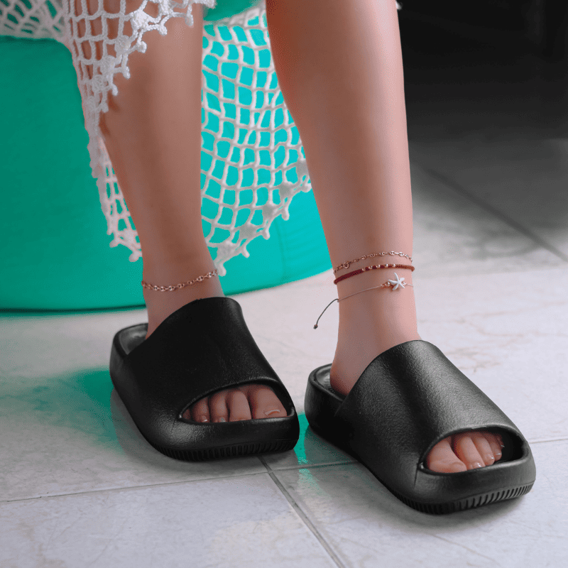 Aurora™ es un modelo distintivo de chanclas con suela EVA, caracterizado por su diseño de plataforma elevada (3-4 cm) y correas gruesas texturizadas en color negro. Fabricadas específicamente con suela de EVA, que proporciona mayor amortiguación y resistencia que las suelas tradicionales. Las imágenes muestran un calzado de silueta robusta con detalles de relieve en la correa superior, ideales para quienes buscan altura adicional sin sacrificar comodidad en uso diario o playero.