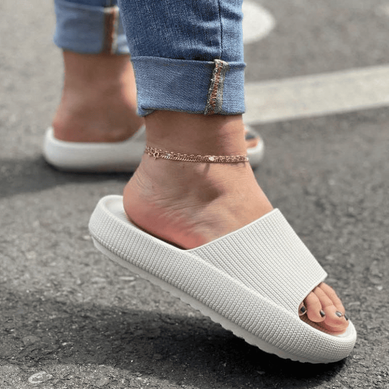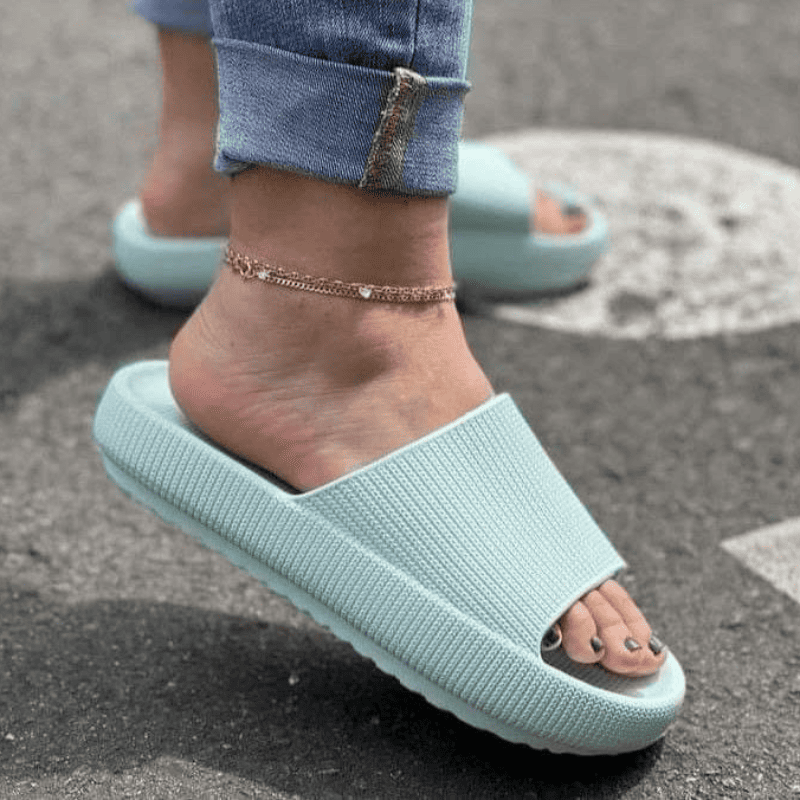 Glamour Step™ presenta un modelo de plataforma de 5 cm con diseño de espina de pescado en la suela, disponible en color negro con acabado brillante. Esta chancla destaca por su correa ancha con textura tipo cocodrilo que añade un toque de sofisticación. La extensa galería de imágenes muestra su versatilidad para combinar con diferentes estilos, desde looks playeros hasta salidas urbanas. A diferencia de modelos similares, su estructura elevada proporciona altura adicional sin comprometer la estabilidad al caminar.